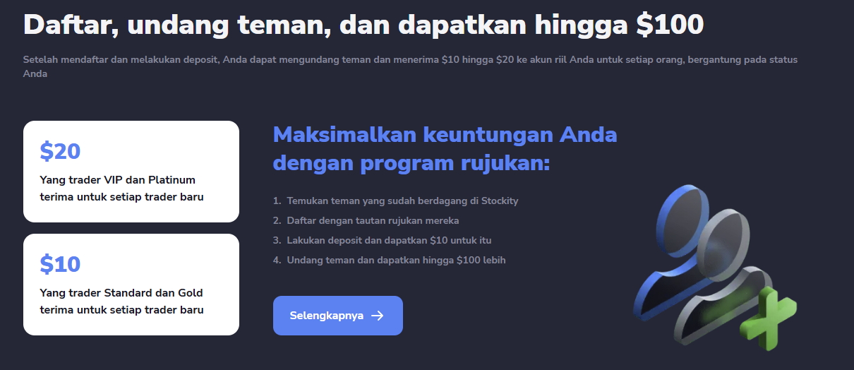 Stockity memberikan layanan hanya kepada pengguna dewasa. Trading online dapat melibatkan risiko keuangan tinggi termasuk kehilangan semua dana di akun trading Anda. Harap pelajari semua risiko dan mintalah saran dari penasihat keuangan independen sebelum menggunakan layanan Stockity. Kami juga merekomendasikan untuk tidak menginvestasikan dana yang tidak Anda sanggup menanggungnya. Stockity tidak bertangung jawab untuk segala kerugian (langsung atau tidak langsung, atau konsekuensial) yang diakibatkan oleh tindakan klien di platform ini.